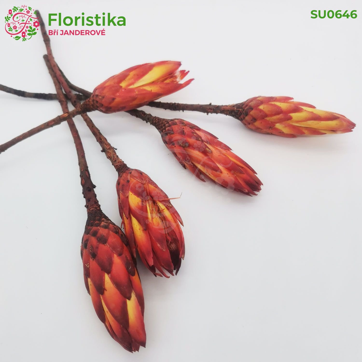 Protea repens red small - hlavičky na stonku stálezeleného keře Protea repens pocházející z jižní Afriky. Tato exotická rostlina se pyšní květy s délkou hlavičky 10 centimetrů a průměrem 3 centimetrů, které jsou umístěny na stonku o délce 35 centimetrů. Hlavičky Protea repens je ideální dekorace do interiéru, nebo dekorace aranžmá. Balení obsahuje 30 kusů.