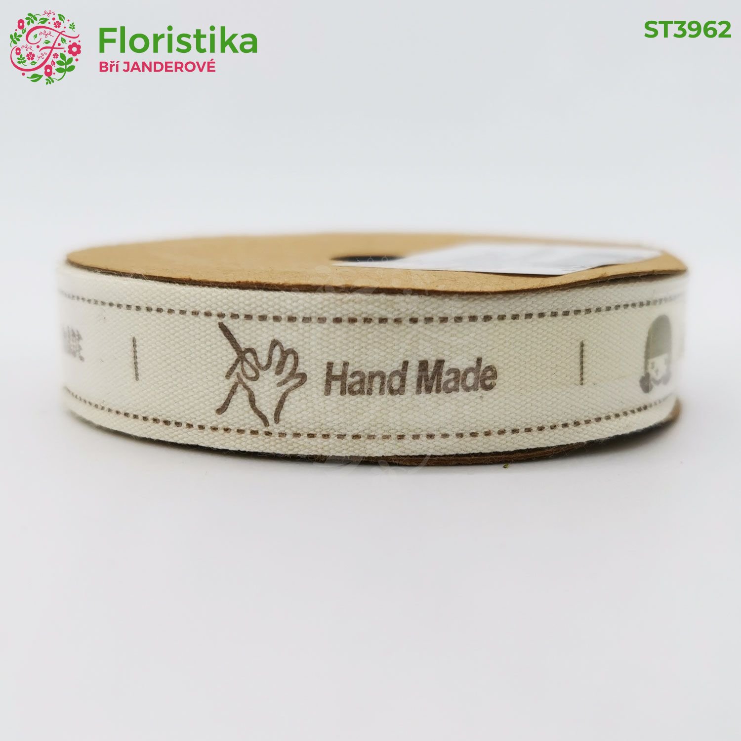 ST3962 Krémová stužka s nápisem HANDMADE a linkou- 1,5cm/4,5m