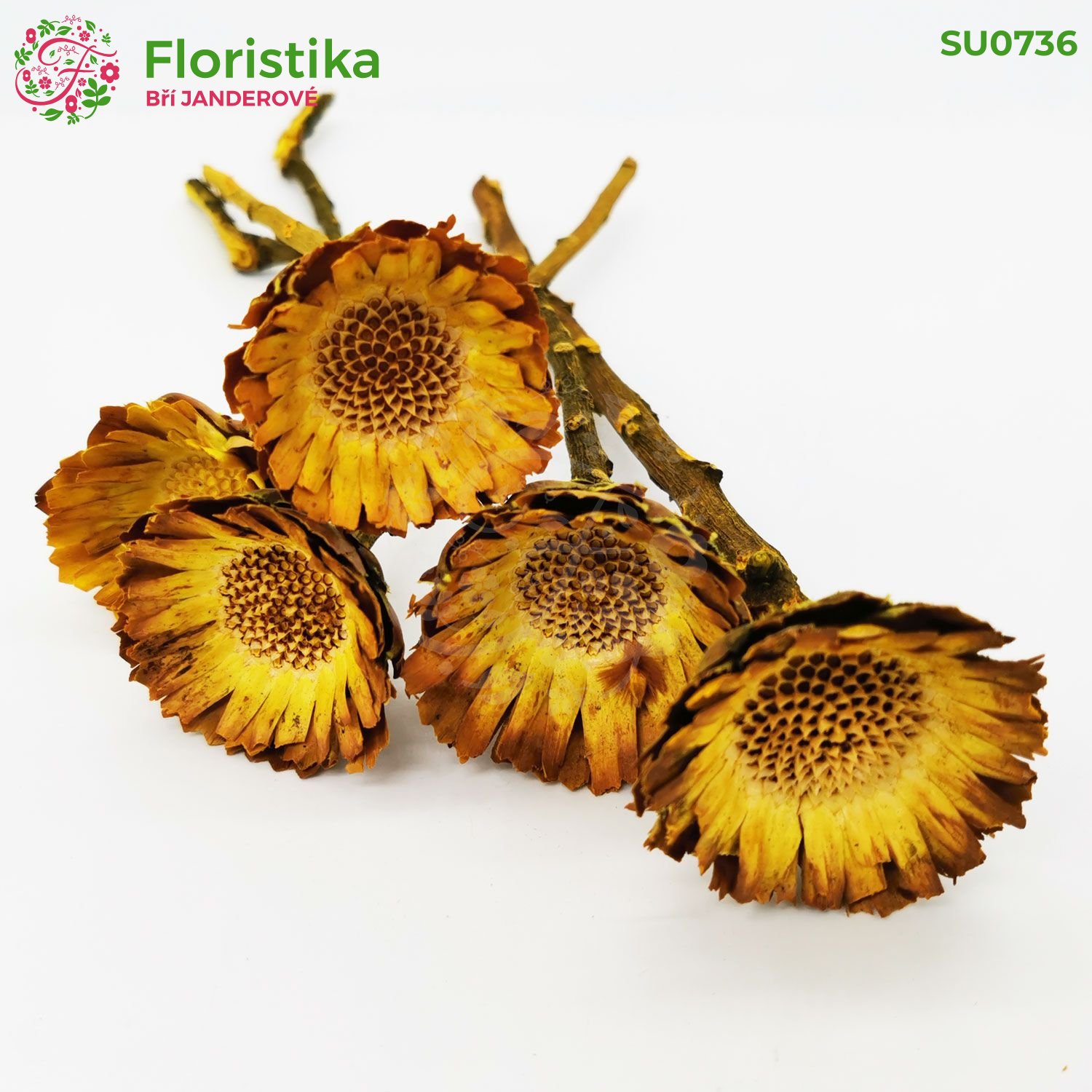 Compacta rosette - efektní barvené žluté hlavičky na stonku stálezeleného keře Protea comapcta pocházející z jižní Afriky. Tato exotická rostlina se pyšní květy s průměrem 5-6 centimetrů, které jsou umístěny na stonku o délce cca 30 centimetrů. Hlavičky Protea compacta frosted je ideální dekorace do interiéru, nebo dekorace aranžmá. Balení obsahuje 20 kusů.