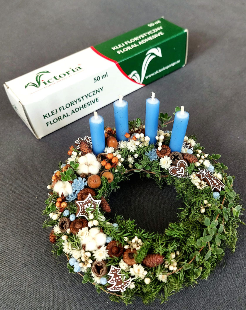 S lepidlom na kvety Victoria® na lístie môžete ľahko vytvárať rôzne kvetinové dekorácie! Vyskúšajte si vytvoriť vlastný kvetinový veniec z rezaných kvetov a čerstvých zelených listov. Jednoducho prilepte listy brečtanu na drôt ako základ a potom pripevnite svoje obľúbené čerstvé kvety. S trochou kreativity môžete ľahko vytvoriť jedinečné dekorácie na svadby, narodeninové oslavy a iné podujatia. Vlastnoručne vyrobená kvetinová dekorácia je navyše skvelým tipom na originálny darček. Na obrázkoch môžete vidieť kompletne zlepený adventný veniec zo živého a suchého dekoračného materiálu.