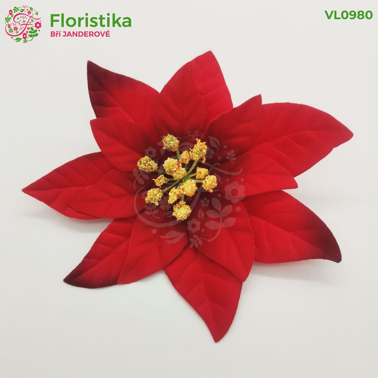 Červená zamatová poinsettia s priemerom 14 cm, balená vo fólii po 12 kusoch. Dá sa prilepiť tavným lepidlom, upevniť na stonku kvetu alebo na drôt na viazanie kvetov.