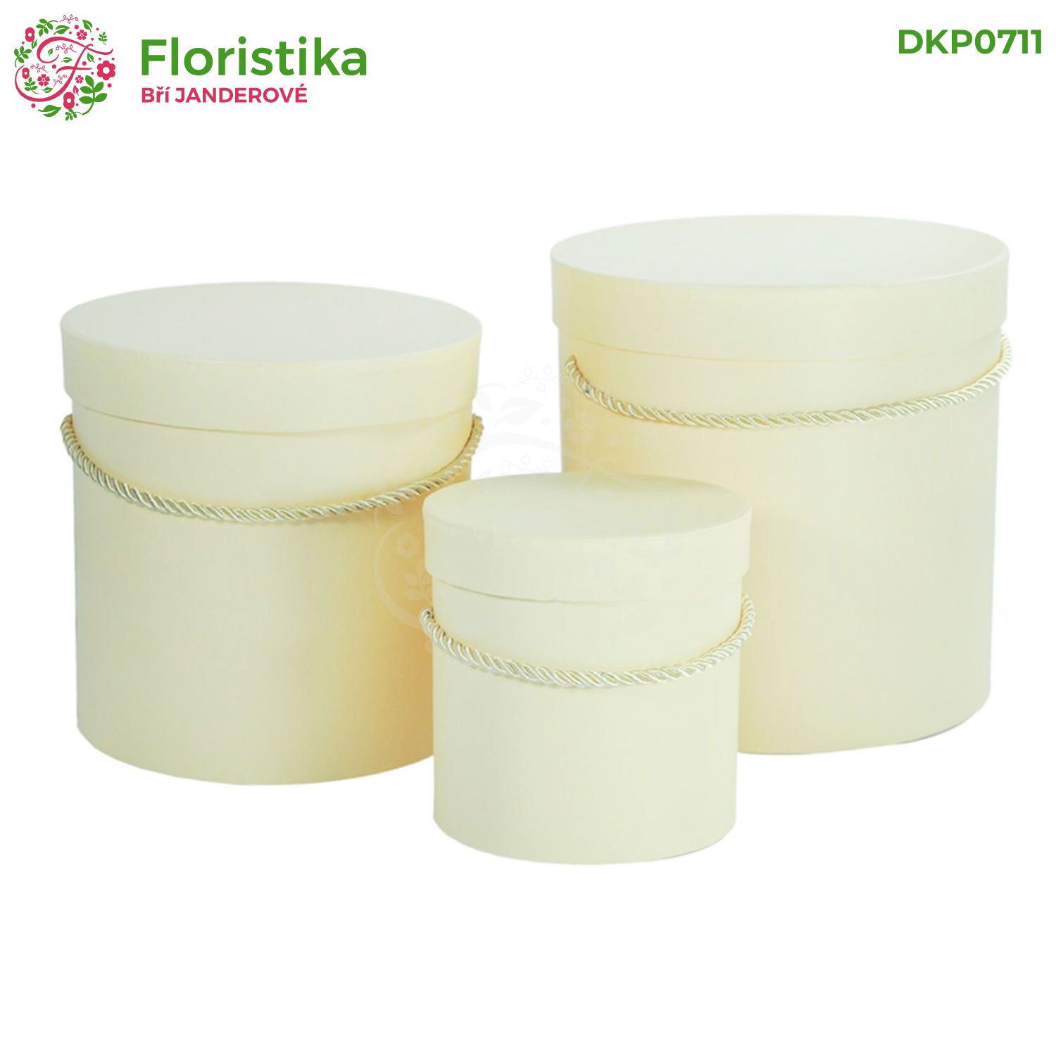 Požiadajte o čokoľvekSada troch okrúhlych škatúľ s viečkom a ozdobnou šnúrkou pre profesionálne kvetinové aranžmány a darčekové balenie. Škatule sú vyrobené z pevnej lepenky a vďaka stohovateľnému dizajnu (zasúvanie do seba) sú veľmi praktické na skladovanie.
